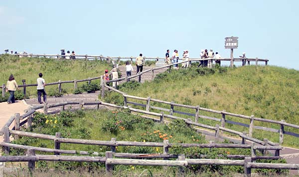 さらに国道244号沿いの、オホーツク海と濤沸湖に挟まれた約8キロメートルの細長い砂丘が「小清水原生花園」。クロユリの神秘的な花がオホーツクの短い夏の到来を告げると、濤沸湖の湖畔にセンダイハギ、ヒオウギアヤメの群生が広がり、7月にはエゾスカシユリやハマナスが咲きそろう。