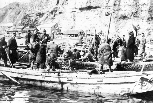 網起しによって集められた鰊を船着き場に陸揚げするため、大きなタモ(網)で鰊をくみ上げる時