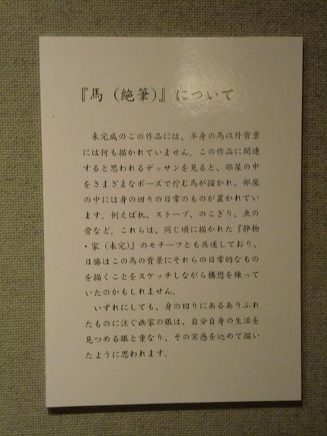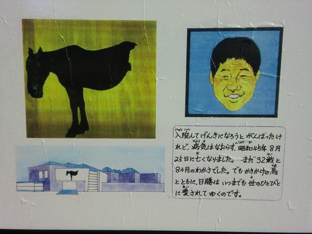 (1937-1970) 昭和12年東京練馬生まれ。疎開で鹿追に移住し、開拓営農のかたわら油彩を制作、全道展会員となる。昭和45年、32歳で亡くなる。代表作のひとつ「馬」(絶筆)を中心に日勝の生活を含めて展示されている。鹿追の人たちの思いが、この美術館運営から伝わってくる。2011年、館長が小檜山博氏から鹿追生え抜きの館長となった。