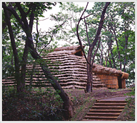 静岡の登呂遺跡・・・・たて穴住居、高床式倉庫、石ぼうちょう、木製農具。